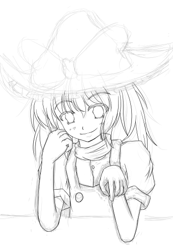 で、これが一枚目、下書き+ペン入れ途中。あと帽子とお下げと手に何持たせるか~みたいな。
